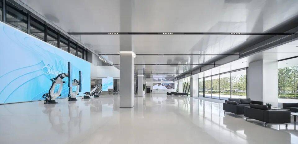 为助力美的集团实现从“传统白色家电企业” 到 “头部科技企业” 的品牌形象升级,杰恩设计在室内设计层面倾注匠心,打造专属品牌气质的空间表达。以大堂区域为例,高挑的空间搭配简练的线条,结合精巧的灯光设计与超大尺寸显示屏,塑造出极具视觉冲击力的科技感空间。材料选用上,采用阳极氧化铝板、人造石、素色岩板与裸顶等材质,兼具优质质感与耐用性,进一步强化空间的科技美学质感。以黑白灰为主的科技感色调,营造出简洁大气、极具现代感的空间氛围。