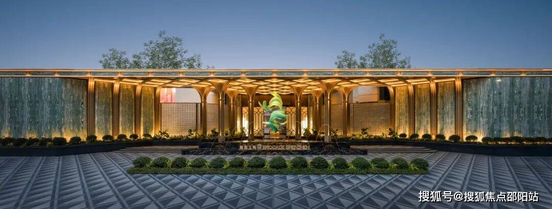 铺陈。20根高达约7米的香槟金立柱巍峨耸立,序列感与力量感交织,形成极具视觉冲击力的城市界面。