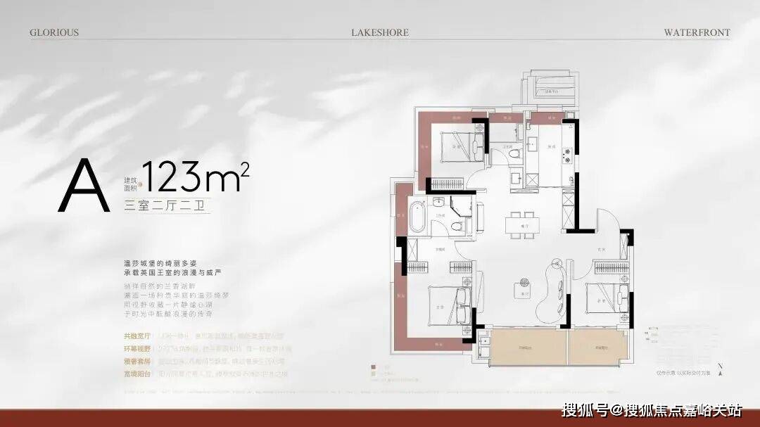 约6.1米横厅多出了一个灵动空间,可满足不同的空间需求,可做开放式书房、茶室等;边套户型主卧为270°明窗。