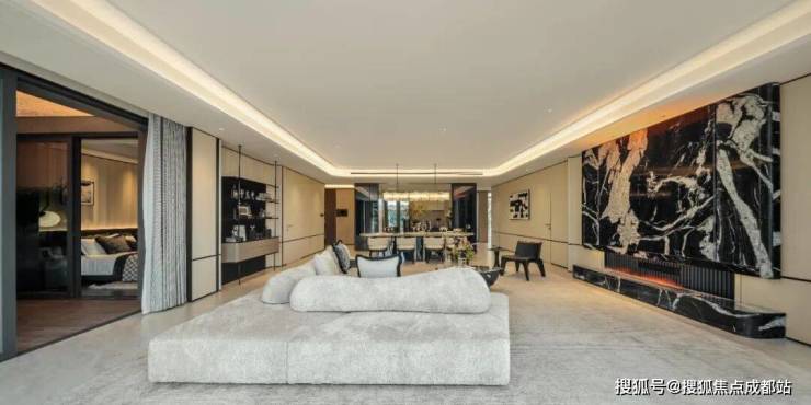 建筑外立面采用90%玻璃幕墙+天然奢石,帆船造型屋顶致敬纽约One57,打造城市地标。园林以《山海经》为蓝本打造30000㎡立体园林,利用12米高差营造层次感。全系奢装标配嘉格纳7-8件套、当代/劳芬等国际品牌,装标达1.2-1.5万元/㎡。